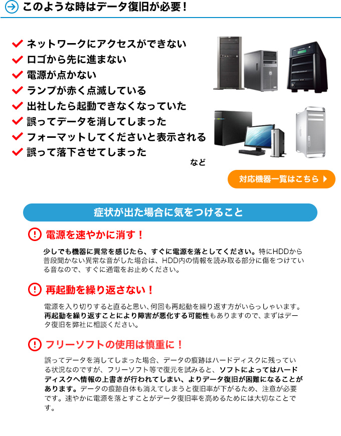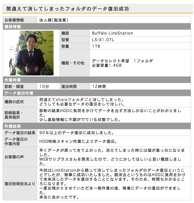 | お客様の声 | 事務所内、共有で使用しているものだったので、明日にでも使いたいデータというものが多数ありました。 |
