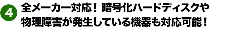 データ復旧専門の会社ですので、セキュリティ強化のために暗号化をかけていたハードディスクや、ハードディスク自体が物理的に故障している重度障害の場合も、データ復旧の対応が可能です。
