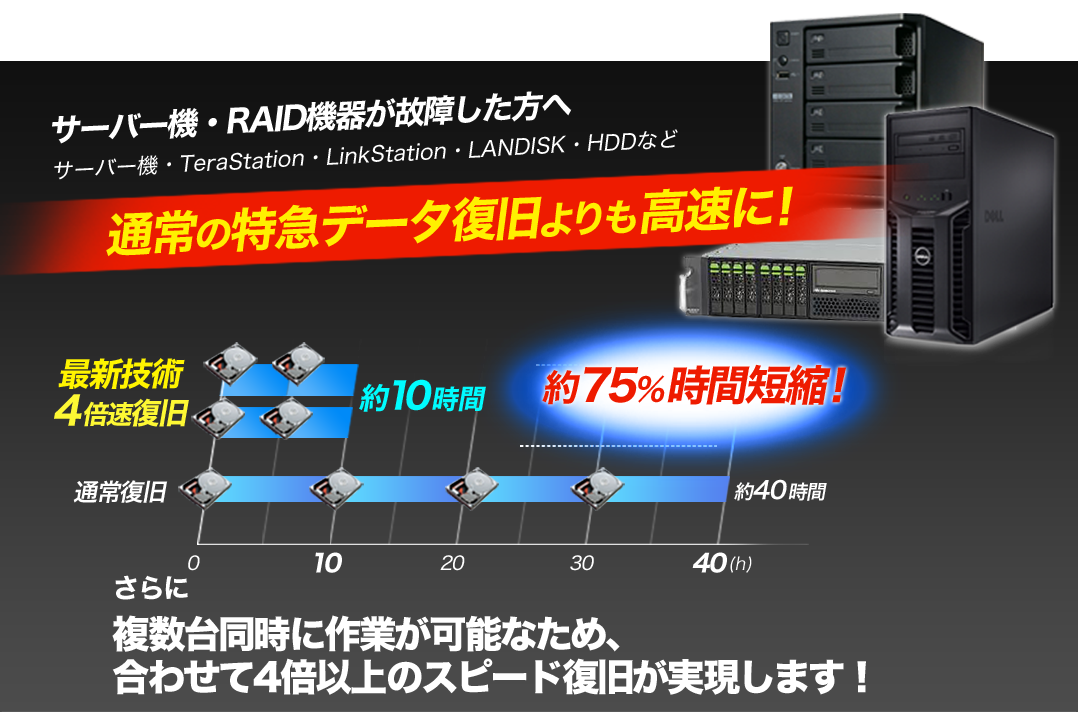 「明日までにデータが必要!」「朝までに必要な書類を復旧してほしい」等のお客様のご希望に応えるために、即日対応や夜間緊急対応も可能です。必要なデータ量や機器の障害状況などの様々な要素によって復旧の作業時間は変わりますが、お客様のご希望に沿えるよう尽力いたします。