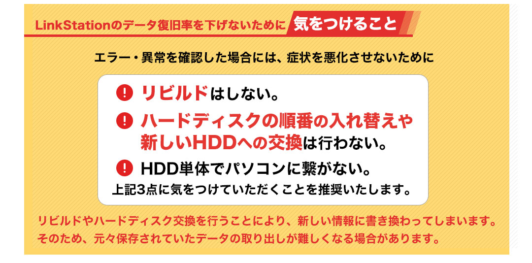 そのため、「必要なデータがLinkStation内に残ったまま」「バックアップが取れていない」等の場合は、データ復旧を行ってから修理を依頼されることをお勧めします。
