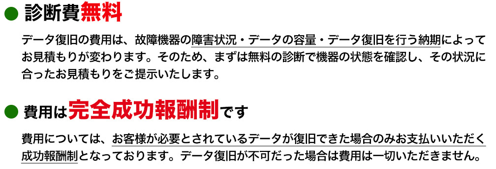 データ復旧の成功時に、お支払いいただきます。お支払い方法はクレジット決済もしくは銀行振込での対応が可能です。復旧不可の場合、無料となります。