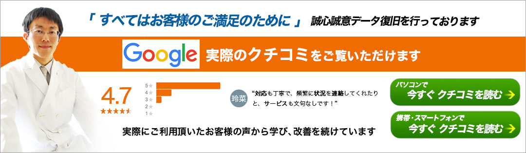 今回は物理的な以上が最悪の状況ではなかったためハードディスクの分解作業等は必要無くクローンを作成することでデータの取り出しが出来ました。幸いお客様が異常が発生した際に通電を止めたことにより大事には至らず即日での納品が出来、お客様には大変ご満足いただけました。