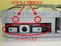 ハードディスクの上にあるCDドライブを外すため、CDドライブを固定しているネジを外します。