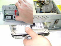 ケーブルを取り外したら、ハードディスク台座の丸い穴に指をかけて、少し持ち上げながら引き出します。